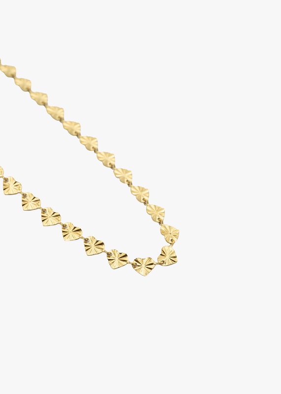 De schakels bestaan uit fijn bewerkte hartvormige schakels met een subtiel glanzende afwerking en gegraveerd patroon dat het licht prachtig reflecteert. De unieke textuur geeft deze ketting een speelse en toch verfijnde uitstraling – perfect om zowel casual als chique outfits mee af te maken.